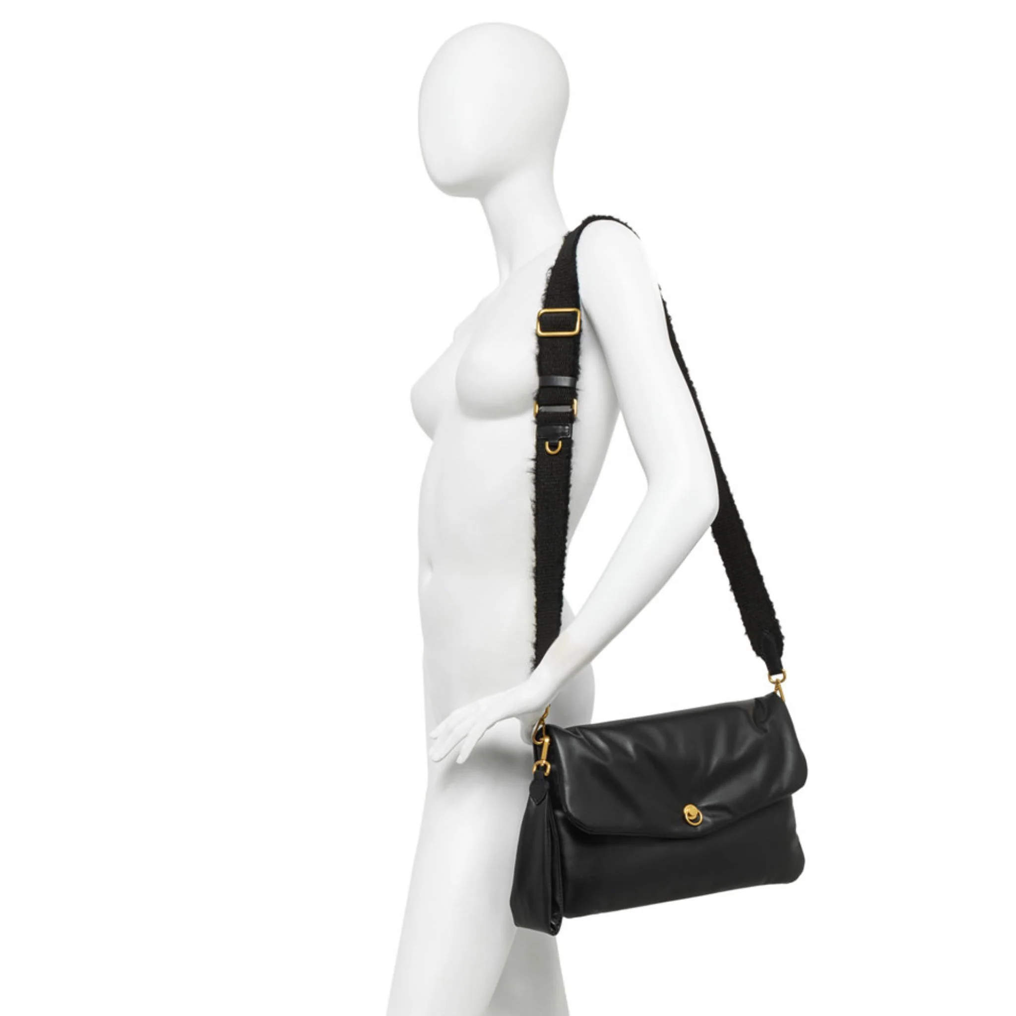 Discover the ultimate in versatile chic with this Gianni Chiarini foldover clutch, a testament to exquisite Italian craftsmanship. Made from soft, supple black leather, this bag seamlessly transitions from a sophisticated clutch to a functional crossbody. Its clever foldover design is secured with a single gold-tone button closure, revealing a spacious interior for your essentials. Carry it as a sleek clutch for an evening out, use the leather wristlet strap for hands-free convenience, or attach the wide, textured crossbody strap to elevate your everyday style. This is a timeless piece designed for the modern individual on the go.